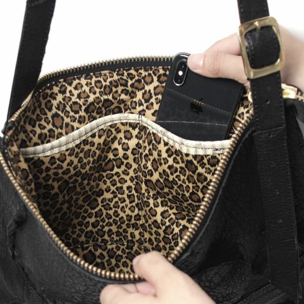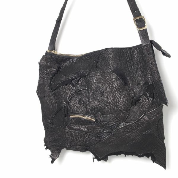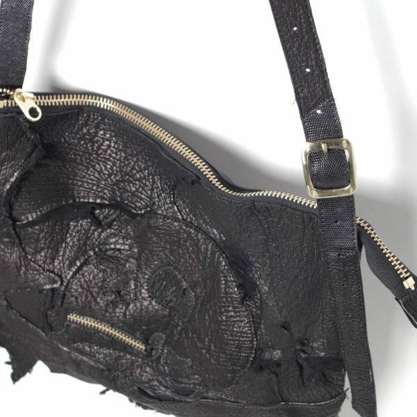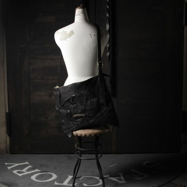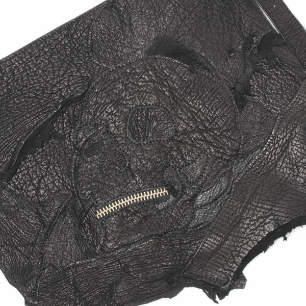 前面に、パッチワークで仕上げたサメ革を使っています。中心部には同じくサメ革で作られたスカルのワッペンが取り付けられています。ベルト部分には、一部トカゲ革が使われています。全体的に柔らかく使いやすいバッグとなっています。