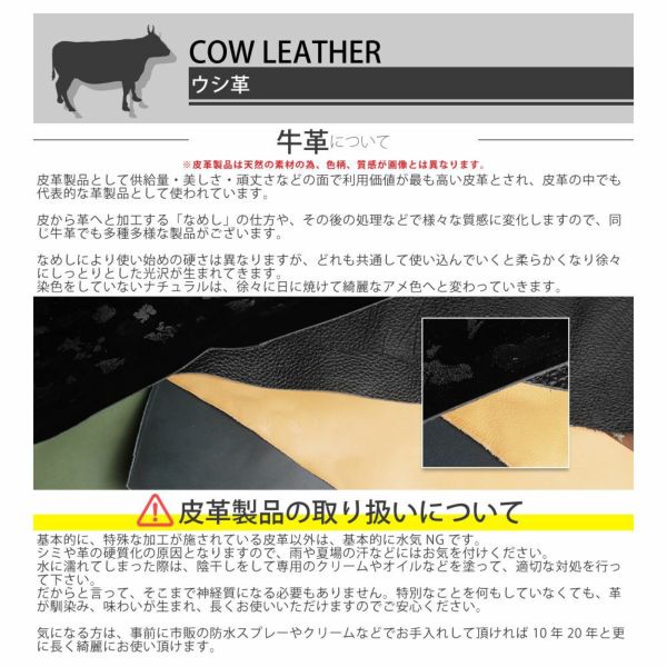 牛革のカラーは全6色、パーツは真鍮(ゴールド)か白銅(シルバー)の2色からお選びいただけます。パーツに関しては”取り付けない”という選択肢も御座いますので、お好みに合わせてお選び下さい。