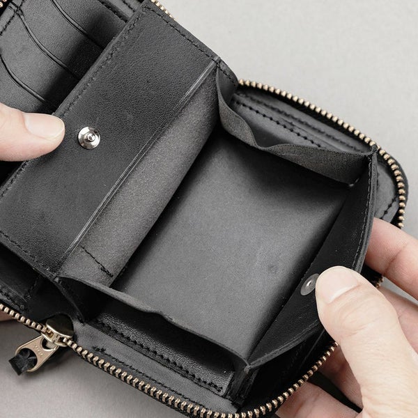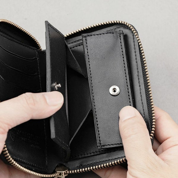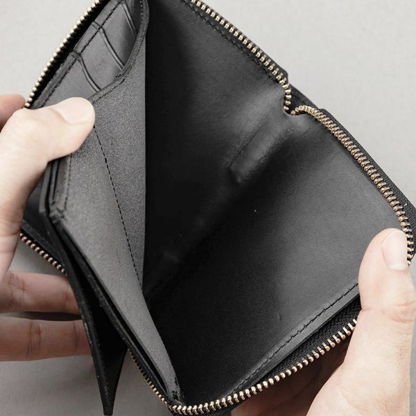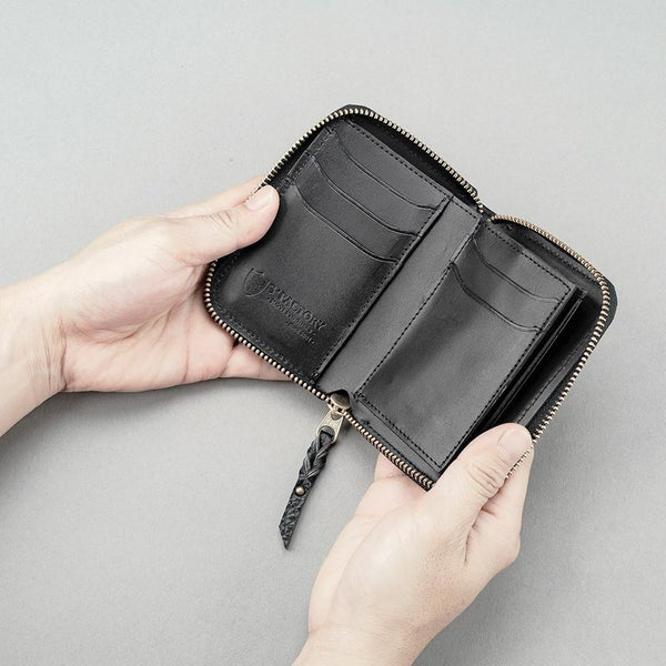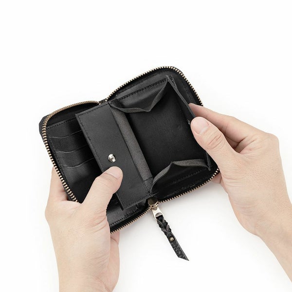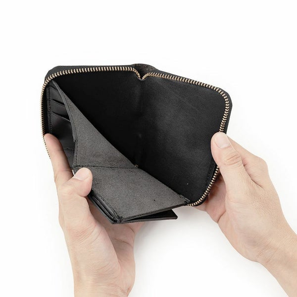 極力コンパクトにまとめ、手に収まりやすいサイズ感に仕上げたラウンドファスナータイプの財布です。
