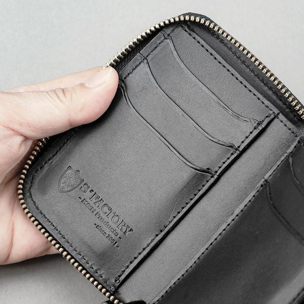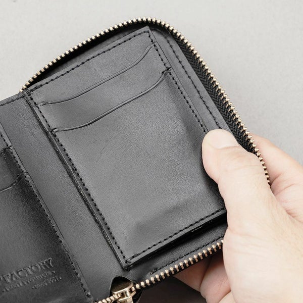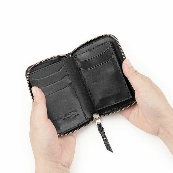 極力コンパクトにまとめ、手に収まりやすいサイズ感に仕上げたラウンドファスナータイプの財布です。