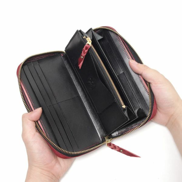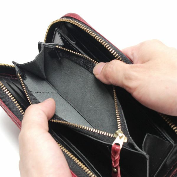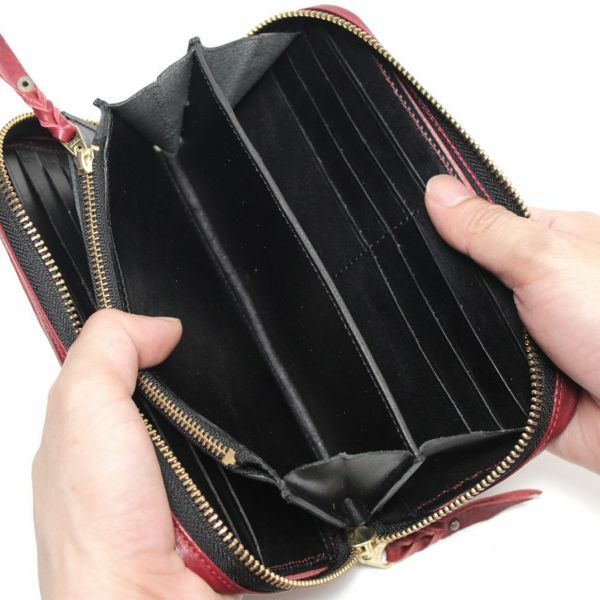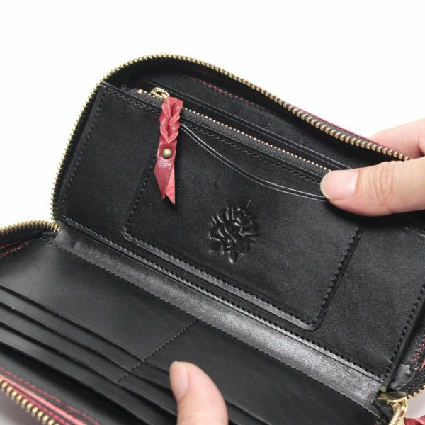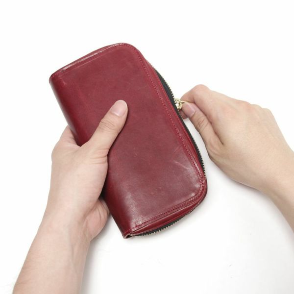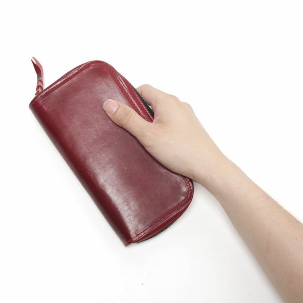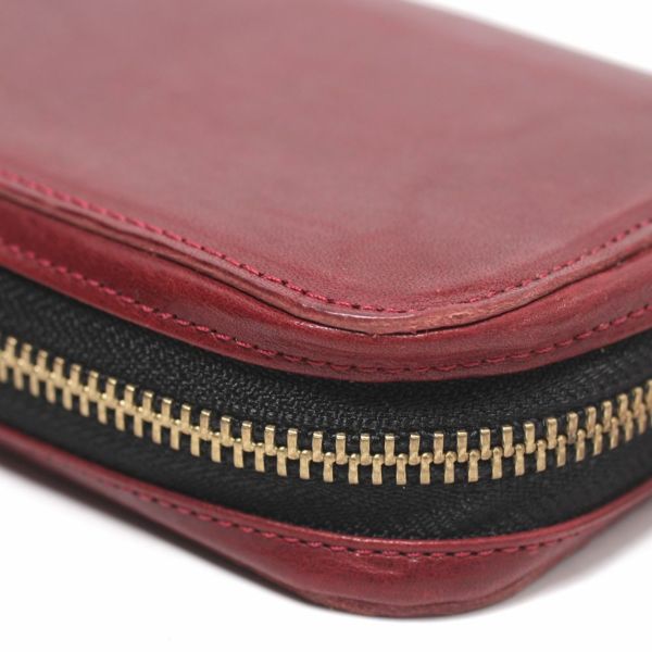 通常商品に比べて、財布を閉じるファスナー部分の仕上がりが多少異なり、通常よりも生地部分が広く露出されています。サンプル製作後、倉庫に保管していたので、きれいな状態です。