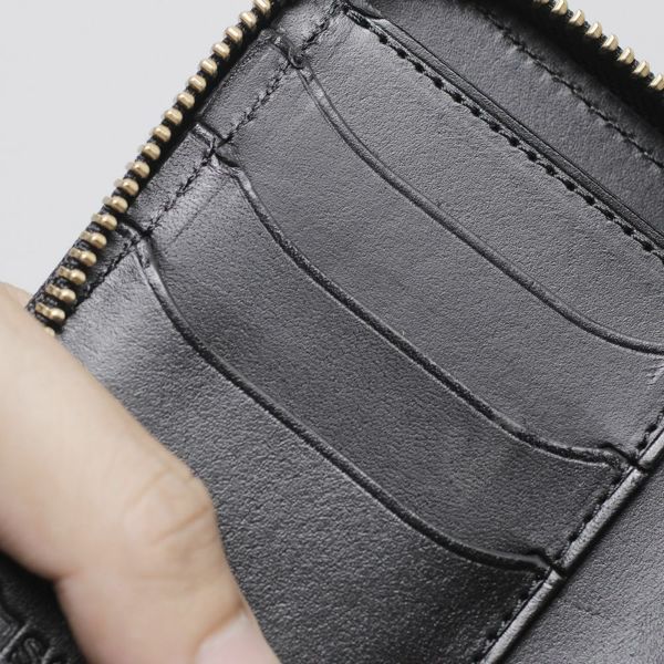 小銭入れは使いやすいBOXタイプの小銭入れになっています。メインのカード入れは5ヶ所と、カードポケット裏と小銭入れ裏にもカードを入れる事が出来ます。札入れは1箇所作っています。