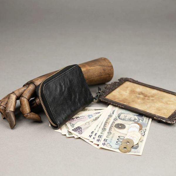 均一ではない凹凸は、まさに“天然素材が生きている証”。それぞれの表情が異なる、一点ものの黒革をお楽しみください。