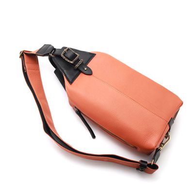 ショルダーベルト部分にも革を使用していますので、前から見ても鮮やかなオレンジ色が目をひきつけます。