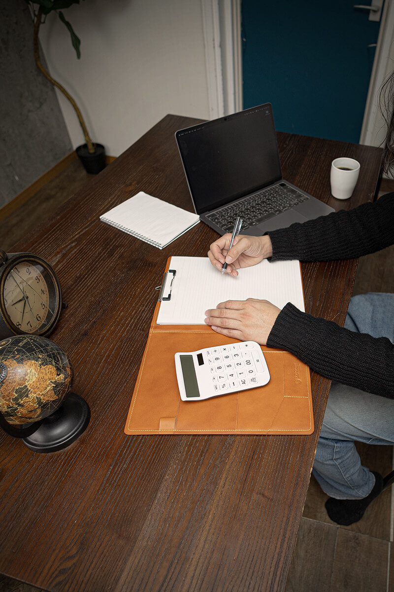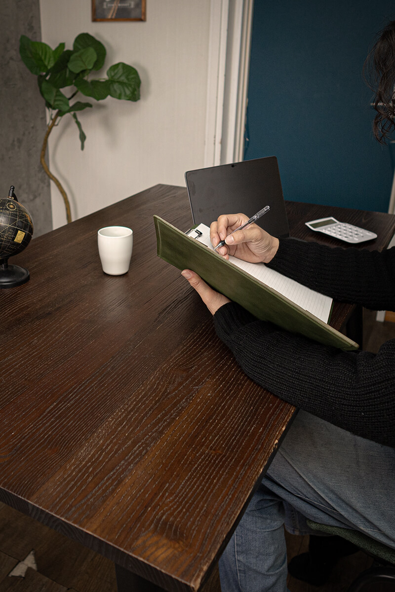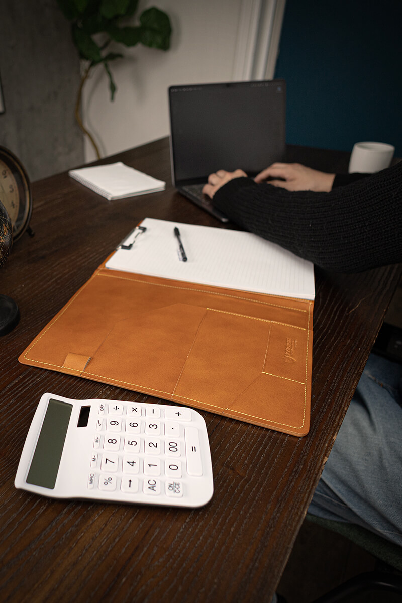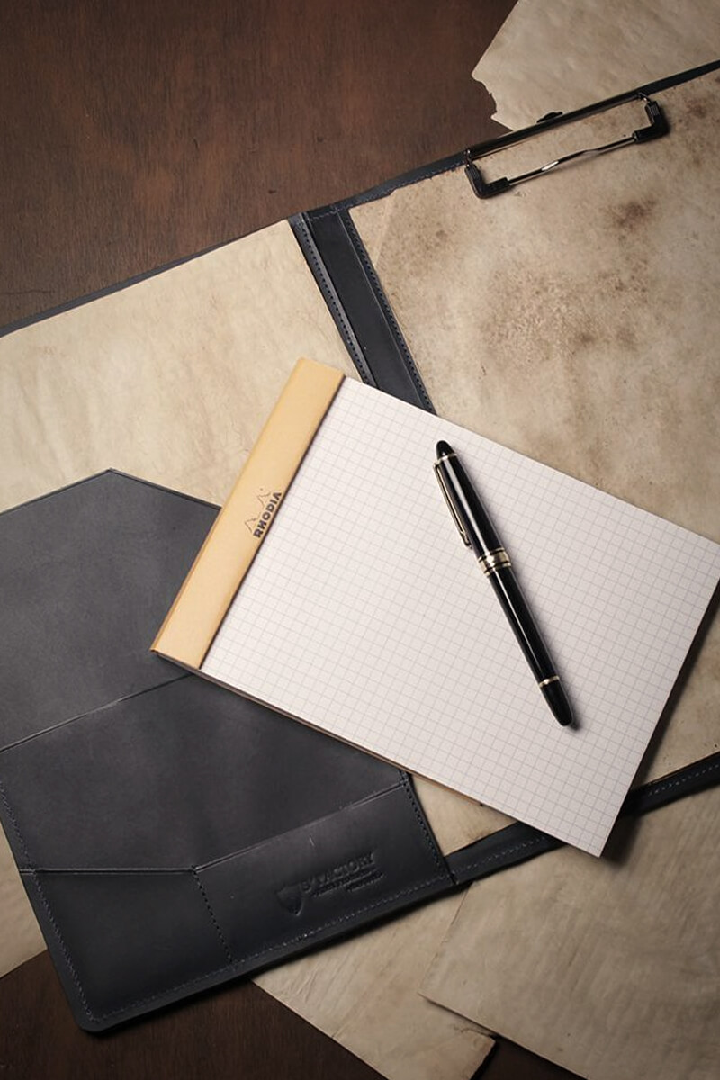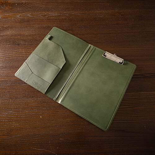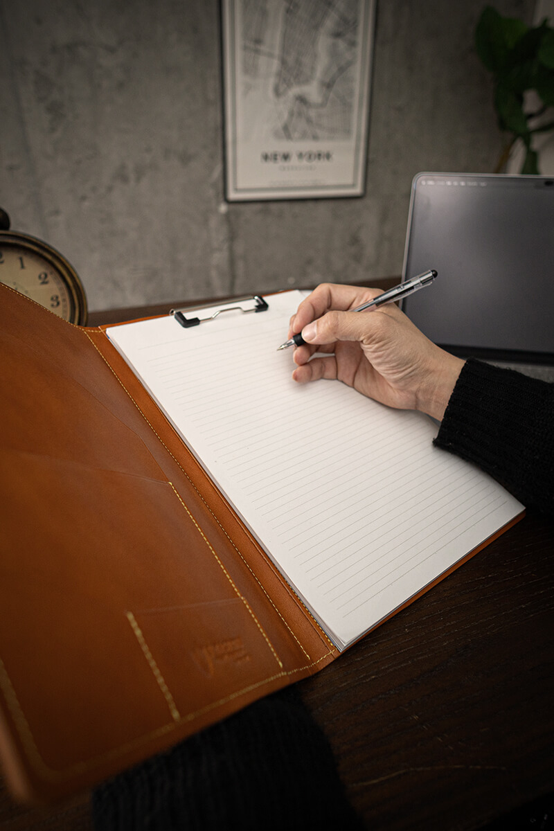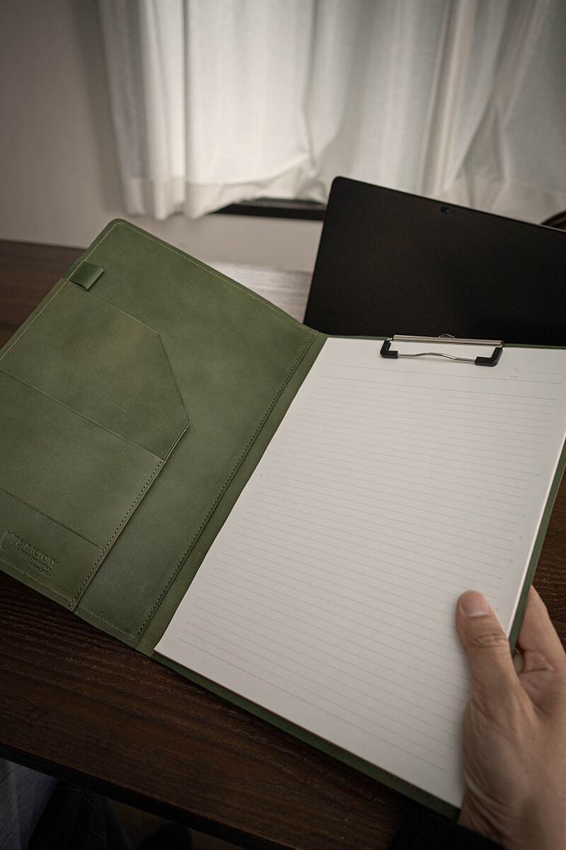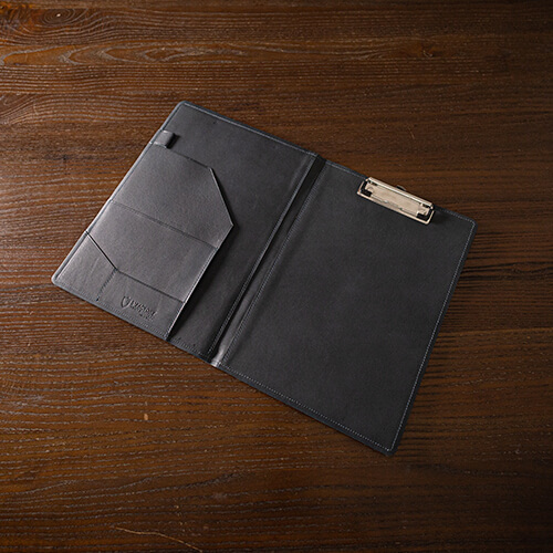 A4サイズ対応で、ポケットやペン差しなど多機能なレザークリップボード(バインダー)です。